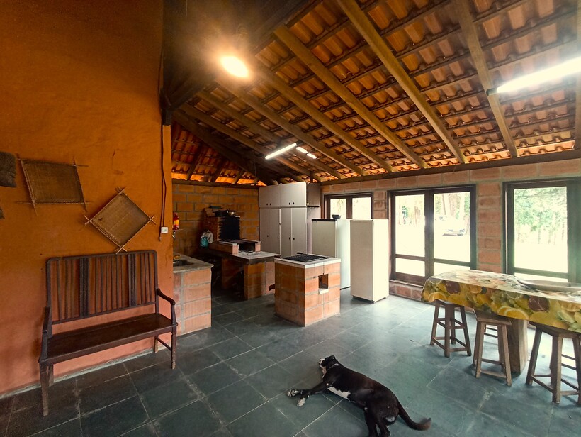 Cozinha com churrasqueira e fogão a lenha;