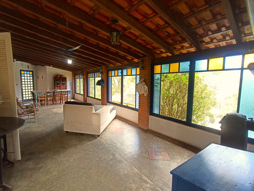 Ampla varanda coberta com vista para piscina;